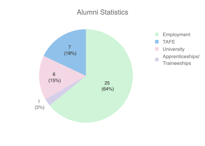 Our alumni program has 39 alumni (predominately Martu men and women), who we assist with their post-school aspirations.